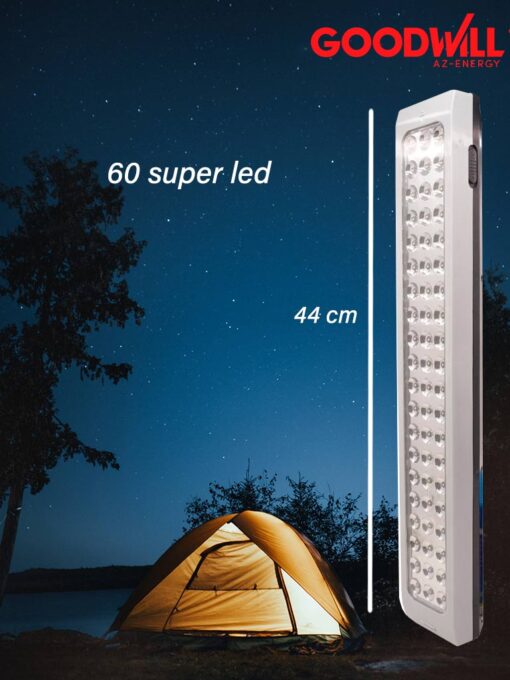 Increíble linterna de camping con diseño compacto. Ideal para camping, caminatas, fallas eléctricas o emergencias. Totalmente recargable con alimentación a conexión de corriente. Hasta 8 horas de luz continua. 60 super Led.